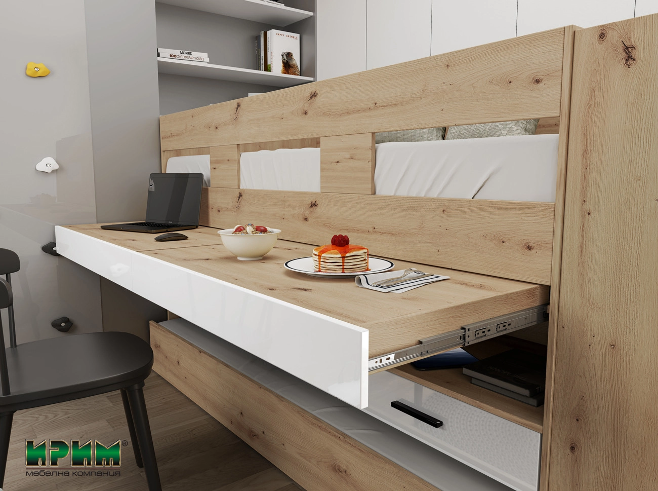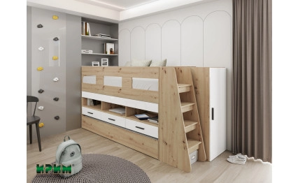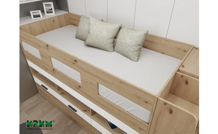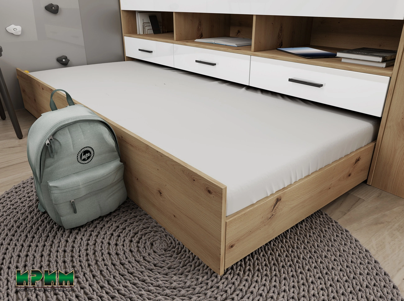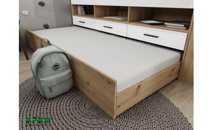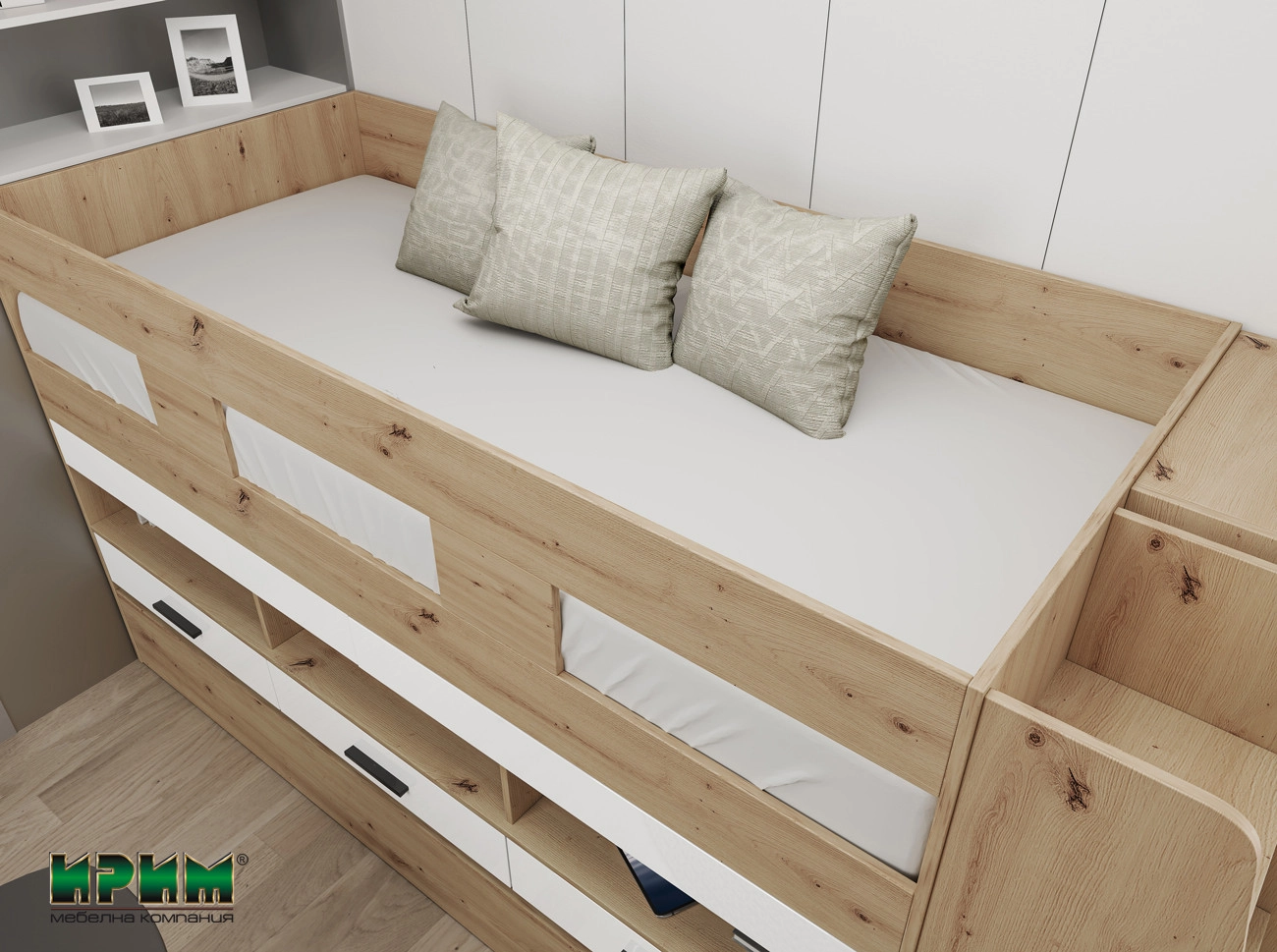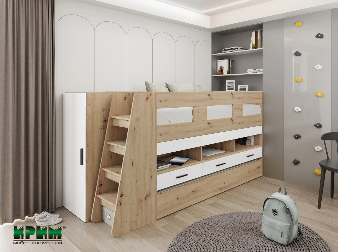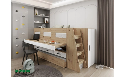 Детско обзавеждане Сити 5052 представлява едно много комфортно предложение за изпълване всички нужди на детска стая. На разположение е горно легло и изтеглящо легло тип чекмедже в долната част. Голям плюс са 2-та изтеглящи плота, снабдени с плавно прибиране, които могат да служат, както за писалище, така и за маса. Комплектът е снабден с множество чекмеджета, ниши и еднокрил гардеробс отделна конструкция, който може да се разполага място по избор.