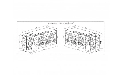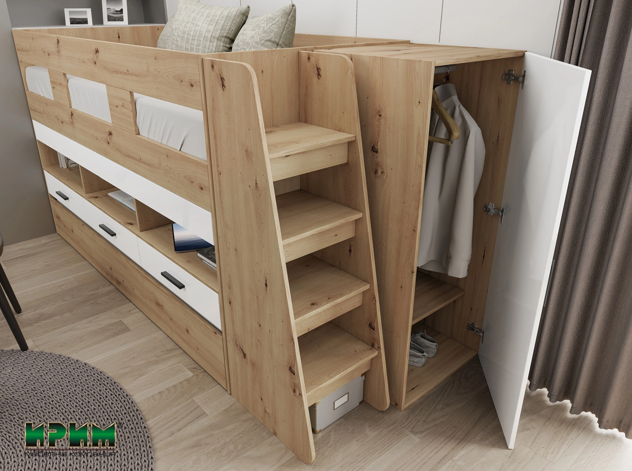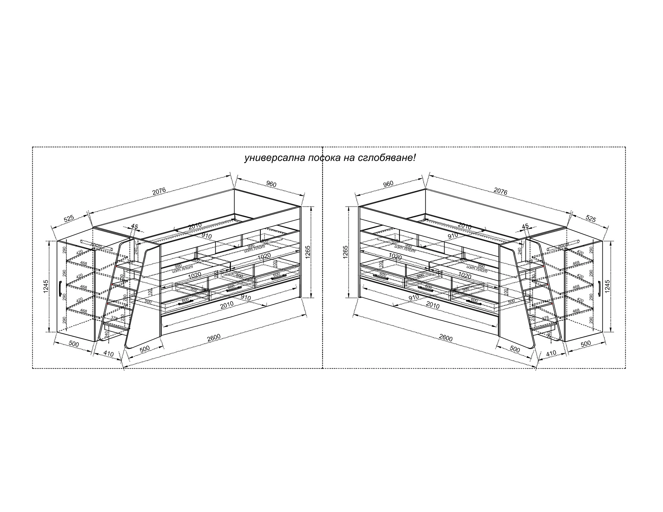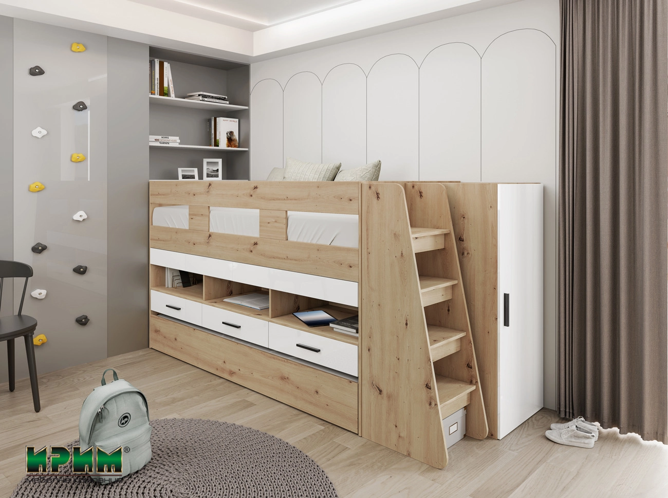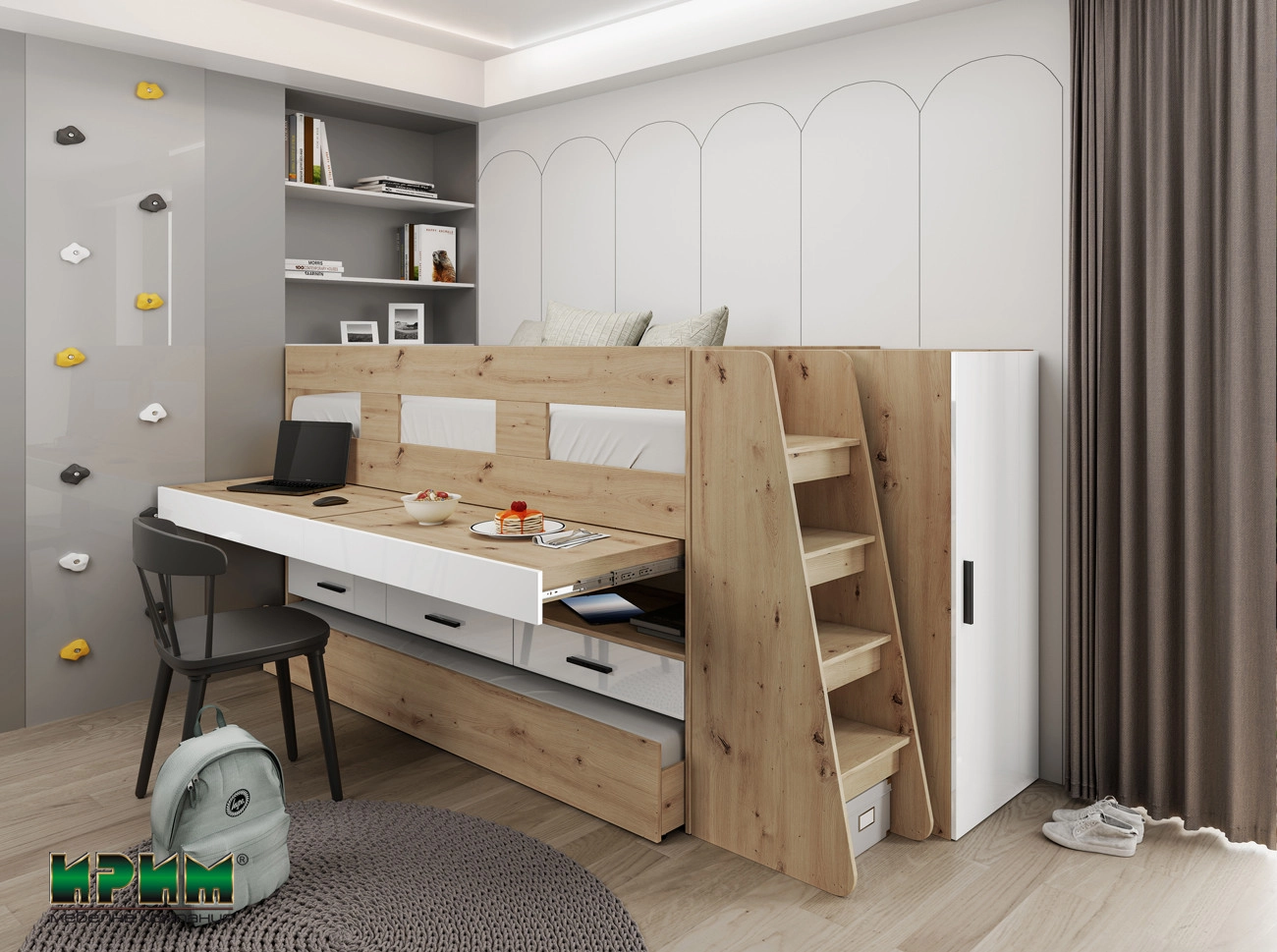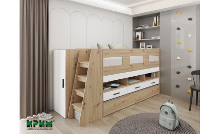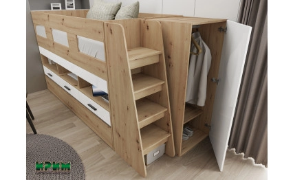 Детско обзавеждане Сити 5052 представлява едно много комфортно предложение за изпълване всички нужди на детска стая. На разположение е горно легло и изтеглящо легло тип чекмедже в долната част. Голям плюс са 2-та изтеглящи плота, снабдени с плавно прибиране, които могат да служат, както за писалище, така и за маса. Комплектът е снабден с множество чекмеджета, ниши и еднокрил гардеробс отделна конструкция, който може да се разполага място по избор.