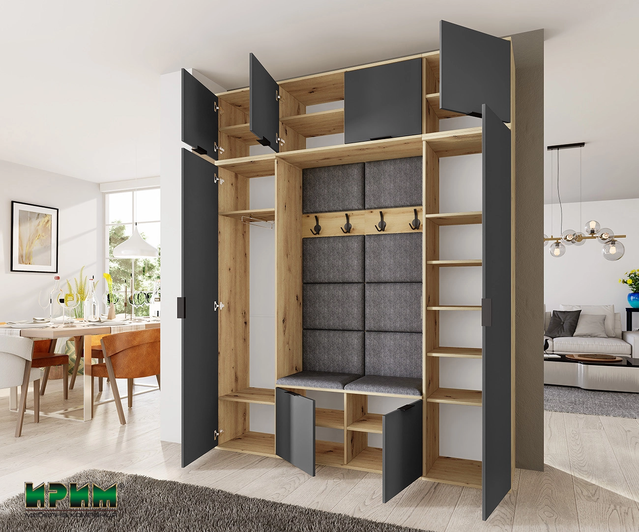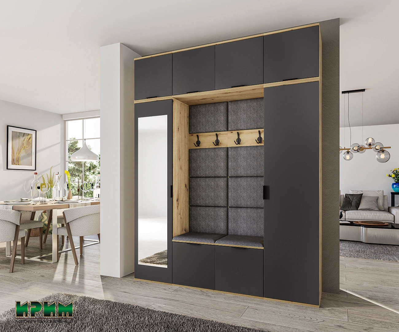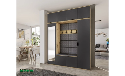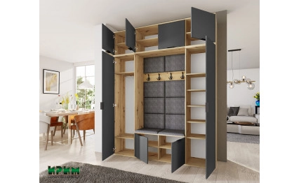 Изцяло нов и модерен модел в страхотна и стилна комбинация с дъб артисан и графит. Голяма новост са тапицериите в сив цвят, които допринасят, както за комфорта, така и за излъчването на коридорното. Модулите могат да се разместят по всякакъв начин, както тапицираните части, така и бандът със закачалки. Гардеробът е снабден с изтеглящ лост. Тапицерия : плат тъмно сив