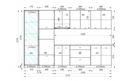 Долен ред - 3370 / 600 / 2230 - дълбочина на шкафовете под плот 550мм