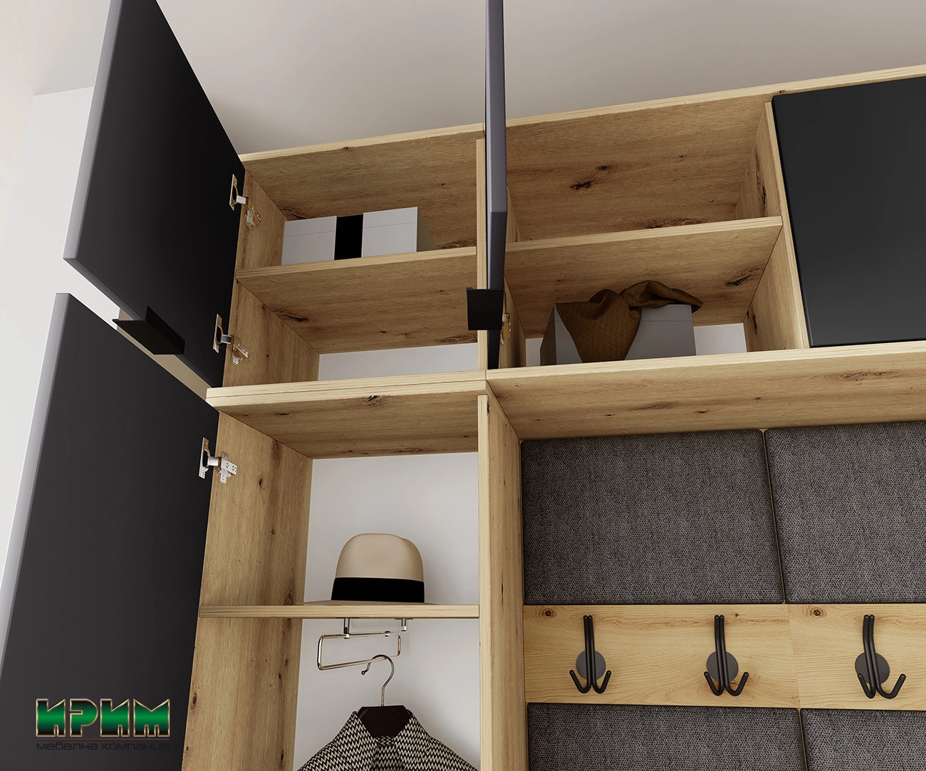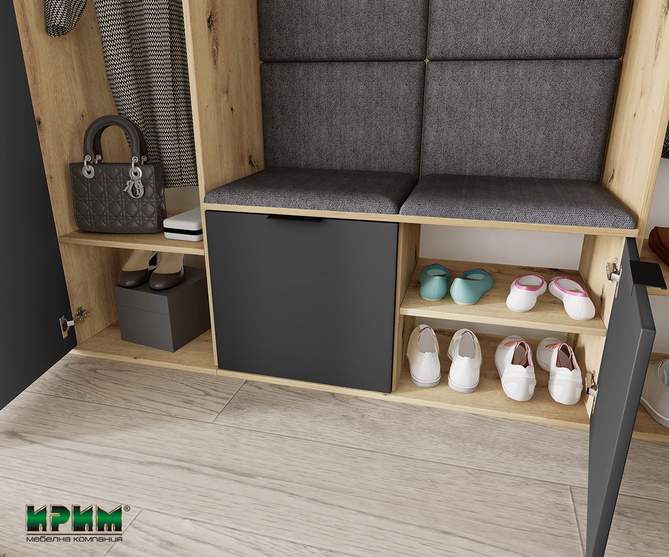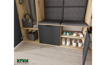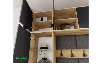 Изцяло нов и модерен модел в страхотна и стилна комбинация с дъб артисан и графит. Голяма новост са тапицериите в сив цвят, които допринасят, както за комфорта, така и за излъчването на коридорното. Модулите могат да се разместят по всякакъв начин, както тапицираните части, така и бандът със закачалки. Гардеробът е снабден с изтеглящ лост. Тапицерия : плат тъмно сив
