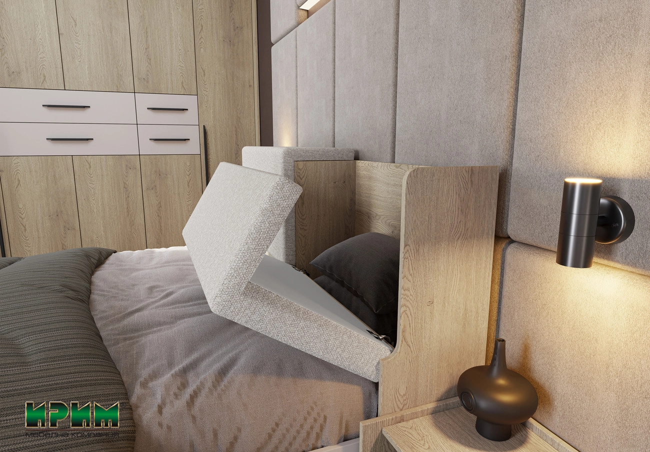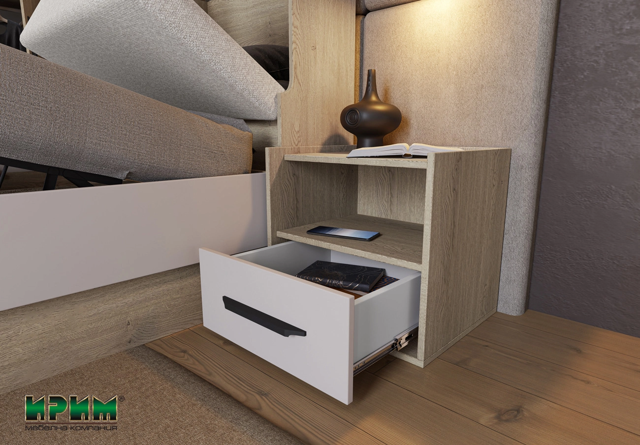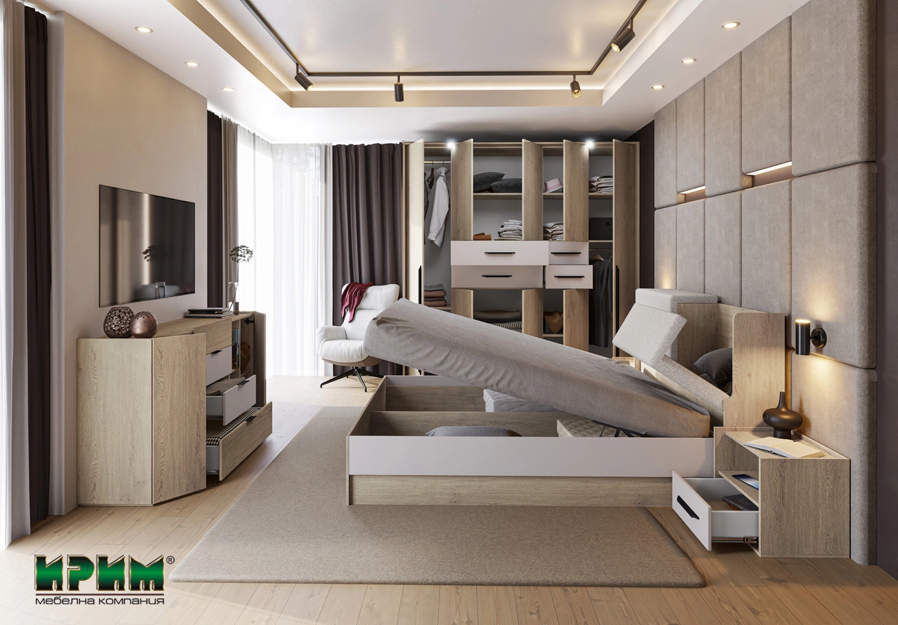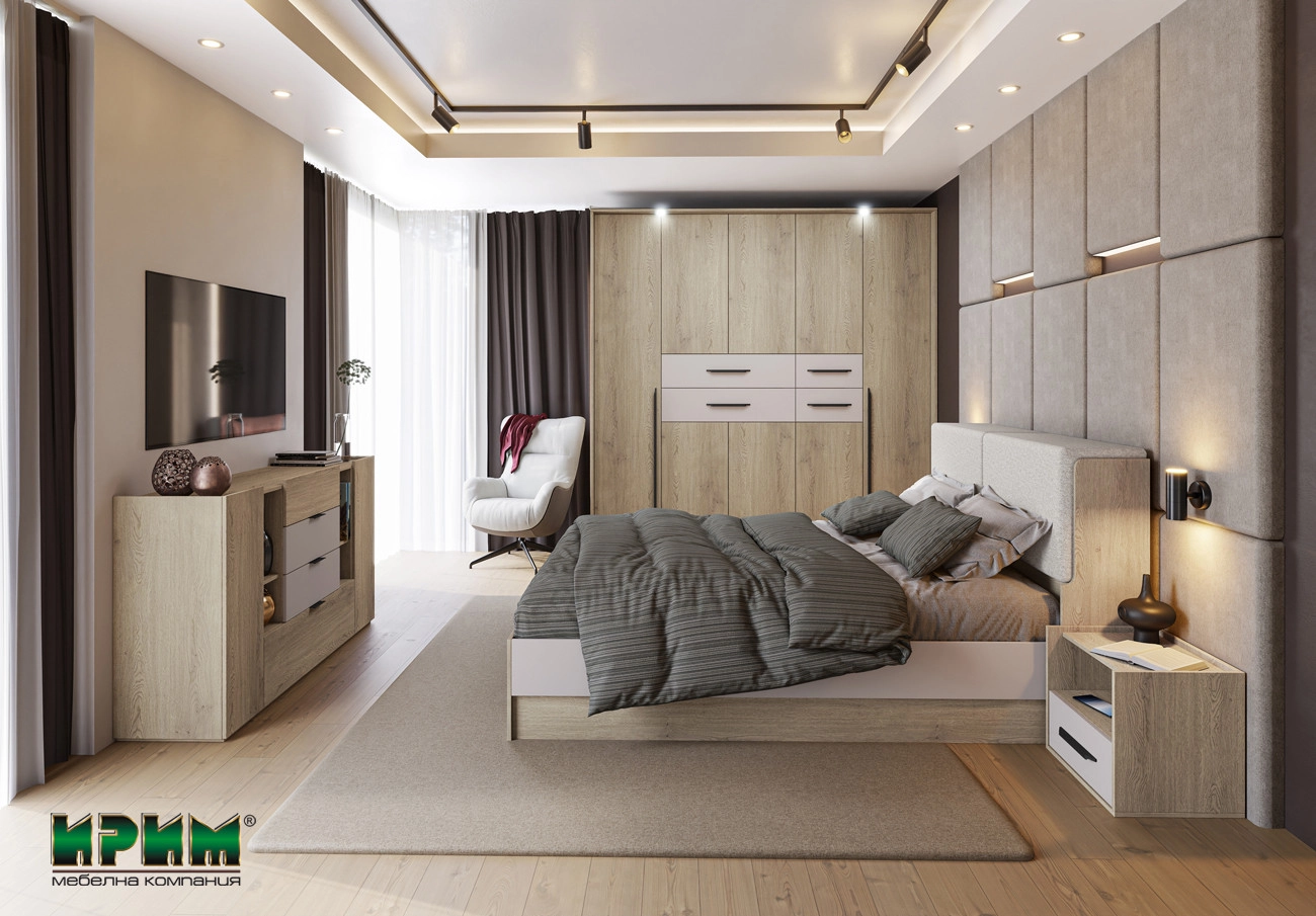 Нова серия с още един нов декор – дъб кота кремона. Декорът представлява много хомогенно и ненатрапчиво светло дърво. Друго уникално преимущество е интересната тапицирана табла с 2 отварящи се напред ракли с място за съхранение. Спалнята има и повдигащ механизъм с подматрачно пространство. Гардеробът е много функционален с множество чекмеджета, рафтове и лед осветление. Скринът се предлага отделно. Спалнята е предвидена за матрак с размер 1600 / 2000мм. Има възможност да се изпозлва, както с еднолицев, така и с двулицев матрак посредством ламелна рамка.